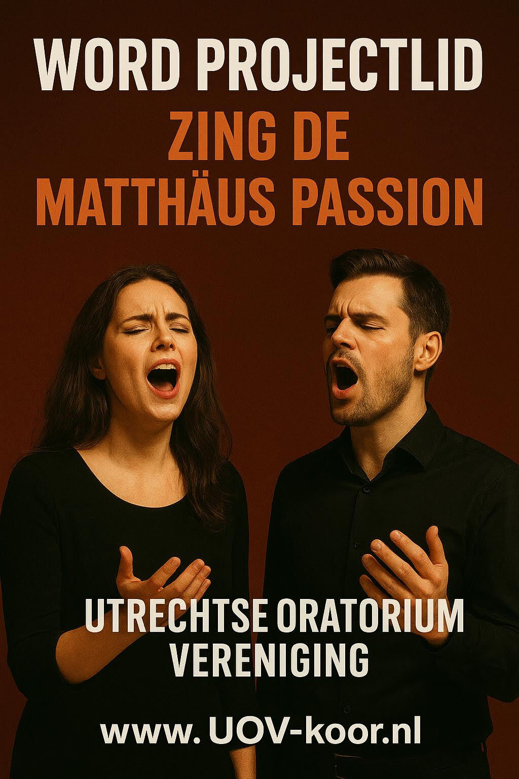 Op zaterdag 28 maart 2026 zal de Utrechtse Oratoriumvereniging de Matthäus Passion uitvoeren in de Jacobikerk. Hierbij zijn ervaren projectzangers van harte welkom! De repetities voor de Matthäus Passion beginnen op dinsdag 14 oktober. Kosten voor het gehele project, inclusief één of twee zaterdagen, bedragen € 220,00. Een stemtest behoort tot de toelatingsvoorwaarden.